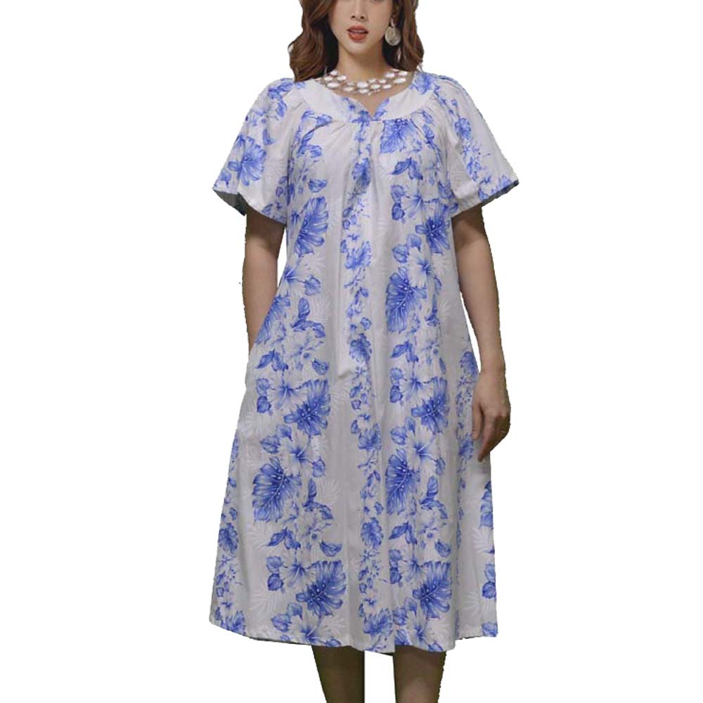 Experience the elegance of Hawaiian tradition with this White Hawaiian muumuu dress for women, handcrafted in Honolulu, Hawaii – USA. Made from 100% soft cotton, it features the Blue Hibiscus panel exclusive print by Ky’s Aloha Shirts, reflecting Hawaii’s vibrant tropical flora. The flowing A-line silhouette with mid-calf length offers a flattering and comfortable fit. A side pocket adds practical charm, making this muumuu perfect for Hawaiian luaus, cultural events, resort wear, or casual island outings.